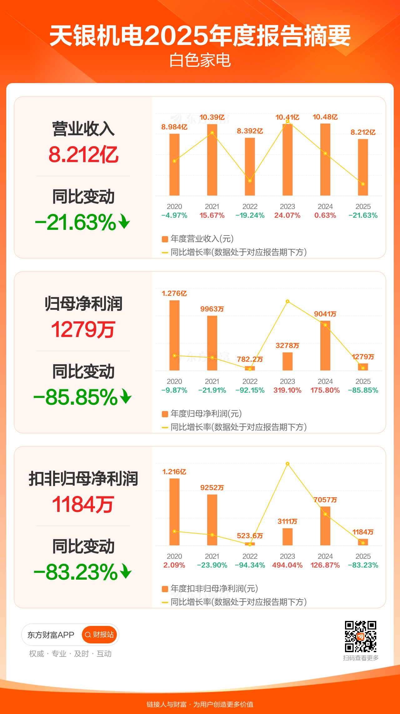 天银机电4月10日发布2025年年报显示,公司全年实现营业收入8.21亿元,同比下滑21.63%;归母净利润1279.13万元,同比下滑85.85%;扣非归母净利润1183.58万元,同比下滑83.23%。