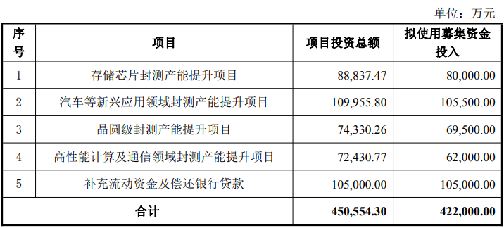 根据预案,本次向特定对象发行股票的募集资金总额不超过42.2亿元(含本数),扣除发行费用后拟全部用于存储芯片封测产能提升项目、汽车等新兴应用领域封测产能提升项目、晶圆级封测产能提升项目、高性能计算及通信领域封测产能提升项目、补充流动资金及偿还银行贷款。