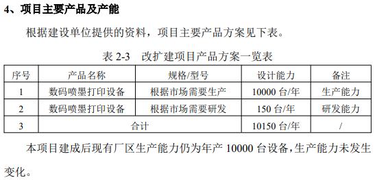 项目建成后,将年产1万台数码喷印打印设备,生产能力未发生变化。