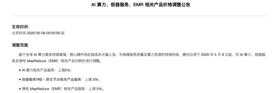 4月9日,腾讯云官网发布公告,鉴于全球AI算力需求持续激增,核心硬件供应链成本大幅上涨,为保障服务质量及算力资源的持续供给,腾讯云将于2026年5月9日起,对AI算力、容器服务及弹性MapReduce(EMR)相关产品刊例价进行调整。其中,AI算力相关产品服务费用上调5%;容器服务TKE-原生节点相关产品服务费用上调5%;弹性MapReduce(EMR)相关产品服务费用上调5%。