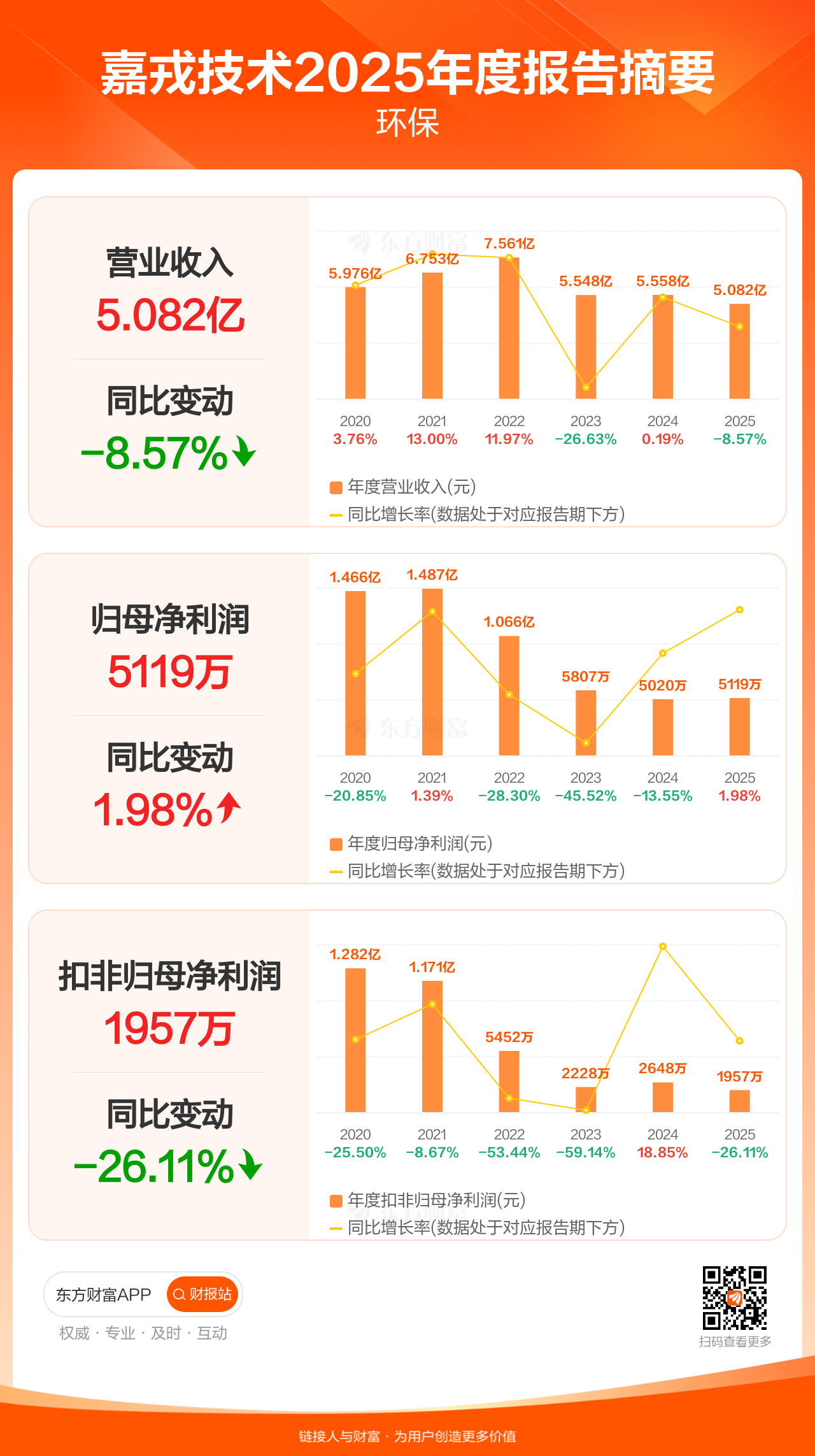 嘉戎技术4月10日发布2025年年报显示,公司全年实现营业收入5.08亿元,同比下滑8.57%;归母净利润5119.37万元,同比增长1.98%;扣非归母净利润1956.68万元,同比下滑26.11%。