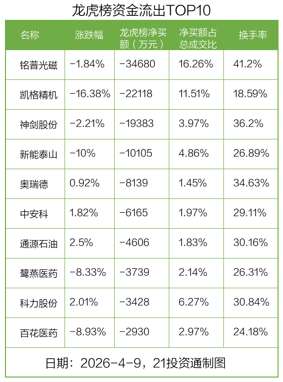 而龙虎榜中资金净流出最多的是铭普光磁(002902.SZ),被净卖出为3.47亿元,占总成交金额的16.26%。铭普光磁收盘下跌1.84%,换手率为41.2%。