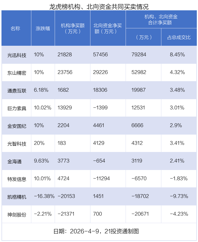 值得注意的是,机构和北向资金共同净买入了光迅科技、东山精密、通鼎互联、金安国纪、光智科技等5股;在凯格精机,神剑股份,金海通,巨力索具,特发信息上出现分歧,机构净卖出凯格精机2.02亿元,北向资金净买入1450.89万元;机构净卖出神剑股份2.14亿元,北向资金净买入699.8万元;机构净买入金海通3773.02万元,北向资金净卖出653.89万元;机构净买入巨力索具1.39亿元,北向资金净卖出1398.6万元;机构净买入特发信息4723.79万元,北向资金净卖出1.13亿元。