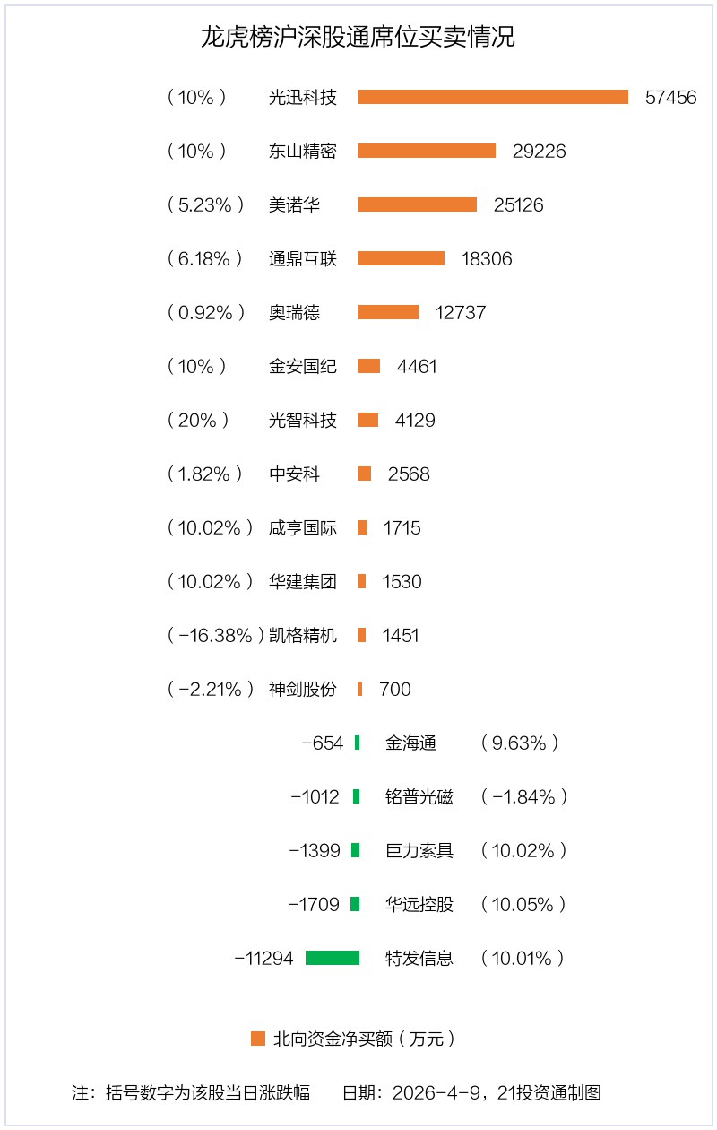 4月9日,上证指数下跌0.72%,深证成指下跌0.33%,创业板指下跌0.73%。盘后龙虎榜数据显示,共有44只个股因当日异动登上龙虎榜,资金净流入最多的是光迅科技(002281.SZ),达11.25亿元。