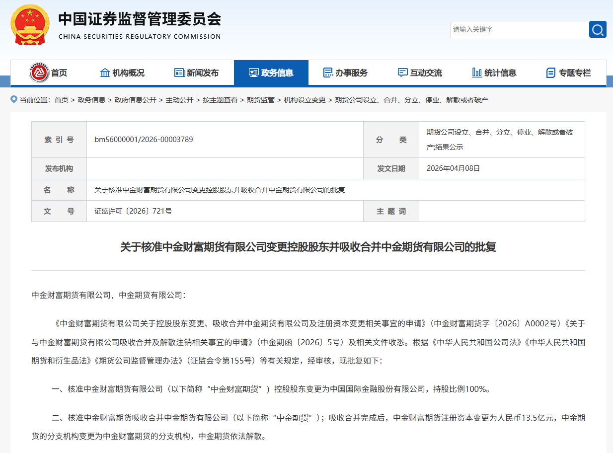 上证报中国证券网讯(记者费天元)4月8日,中国证监会发布公告,核准中金财富期货有限公司(以下简称“中金财富期货”)控股股东变更为中国国际金融股份有限公司,持股比例100%;核准中金财富期货吸收合并中金期货有限公司(以下简称“中金期货”)。吸收合并完成后,中金财富期货注册资本变更为人民币13.5亿元,中金期货的分支机构变更为中金财富期货的分支机构,中金期货依法解散。