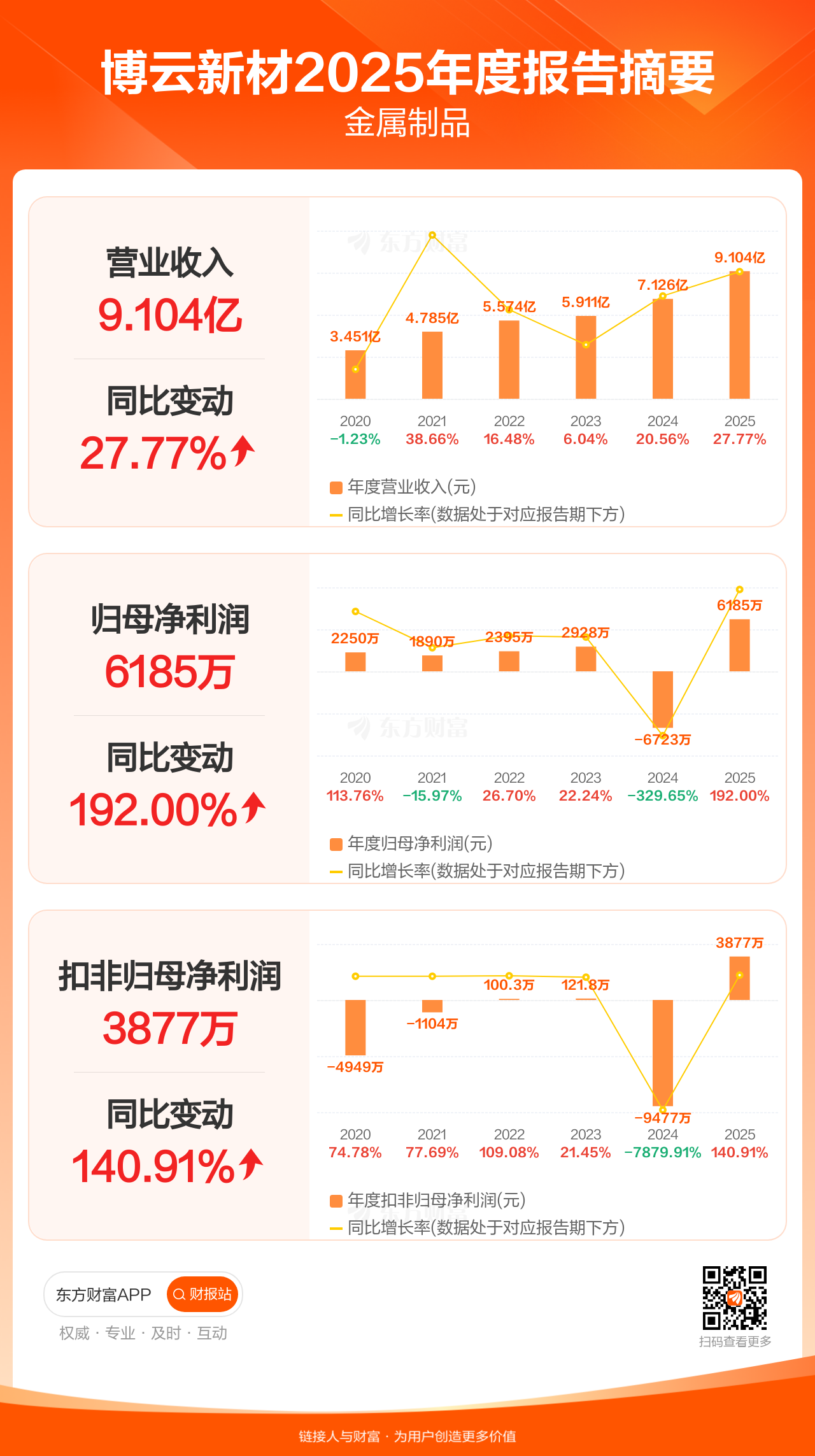 博云新材4月10日发布2025年年报显示,公司全年实现营业收入9.10亿元,同比增长27.77%;归母净利润6185.36万元,同比增长192.00%;扣非归母净利润3876.58万元,同比增长140.91%。