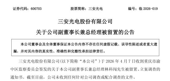 4月8日晚,三安光电公告透露,4月7日收到重庆市渝中区监察委员会签发的关于三安光电副董事长兼总经理林科闯被留置、立案调查的通知书。