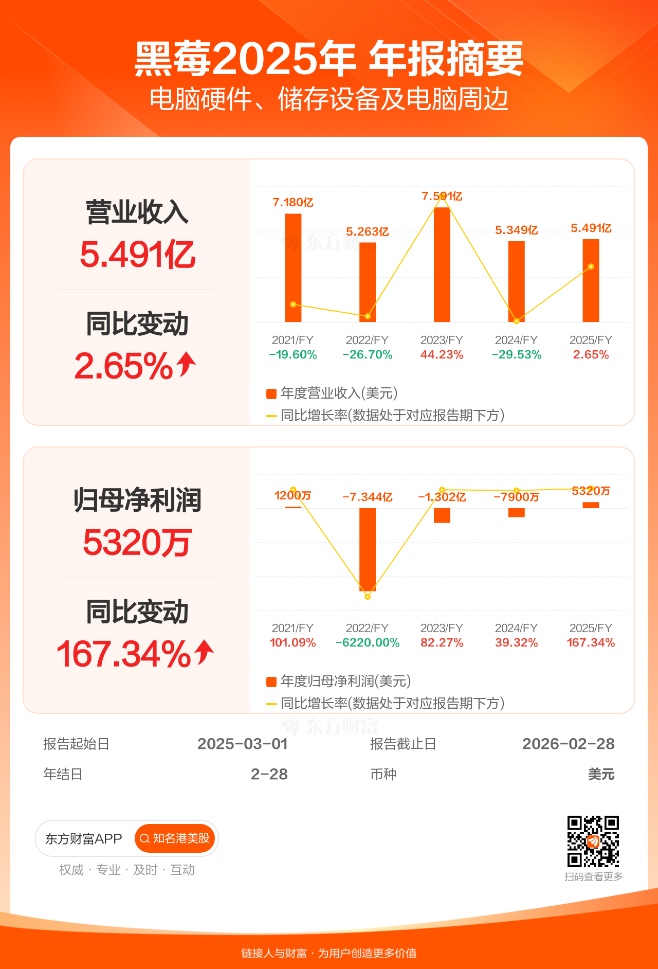 黑莓4月9日发布年报业绩,截至2026年2月28日的12个月内,该公司营业收入5.49亿美元,同比增长2.65%;公司权益持有人应占溢利(归母净利润)5320.00万美元,同比增长167.34%。
