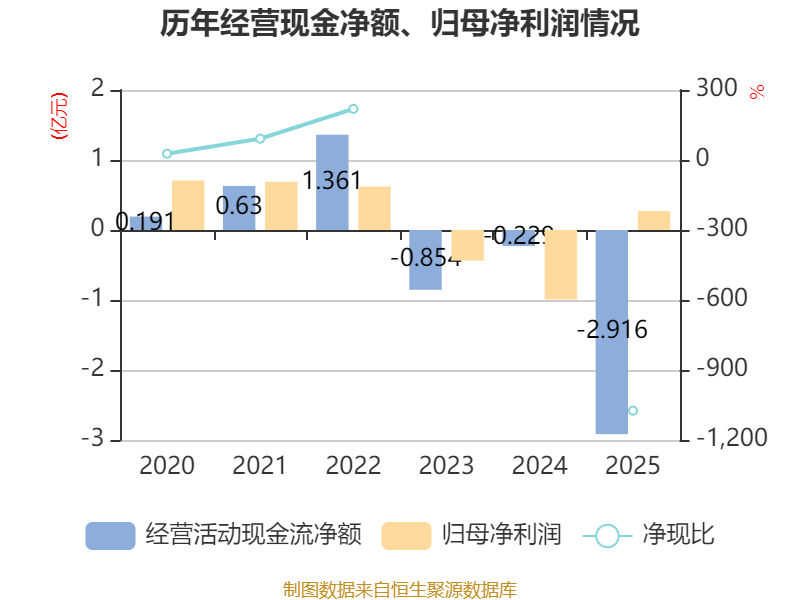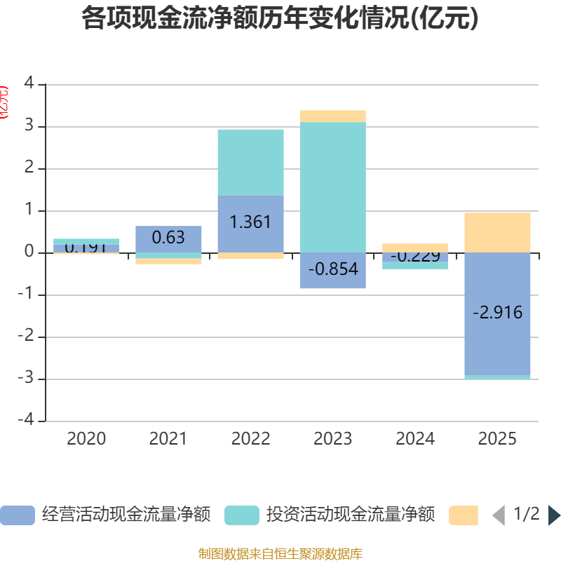 截至2025年,公司经营活动现金流净额为-2.92亿元,同比减少2.69亿元;筹资活动现金流净额9443.3万元,同比增加7325.72万元;投资活动现金流净额-908.07万元,上年同期为-1712.66万元。
