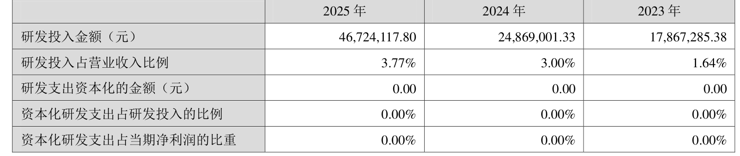 2025年全年,公司研发投入金额为4672.41万元,同比增长87.88%;研发投入占营业收入比例为3.77%,相比上年同期上升0.77个百分点。此外,公司全年研发投入资本化率为0%。