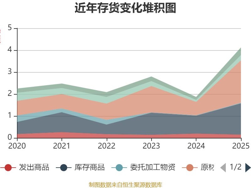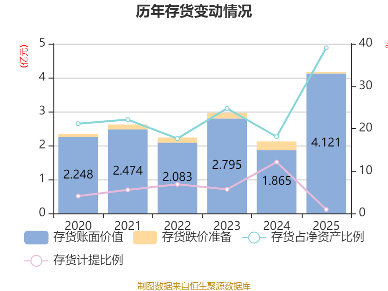 从存货变动来看,截至2025年末,公司存货账面价值为4.12亿元,占净资产的39.02%,较上年末增加2.26亿元。其中,存货跌价准备为381.83万元,计提比例为0.92%。