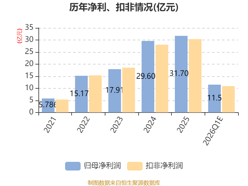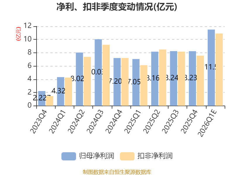 中证智能财讯德业股份(605117)4月9日晚间披露业绩预告,预计2026年一季度归母净利润11亿元至12亿元,同比增长55.91%-70.08%;扣非净利润预计10.4亿元至11.4亿元,同比增长69.78%-86.11%。以4月9日收盘价计算,德业股份目前市盈率(TTM)约为31.49倍-32.37倍,市净率(LF)约12倍,市销率(TTM)约9.59倍。
