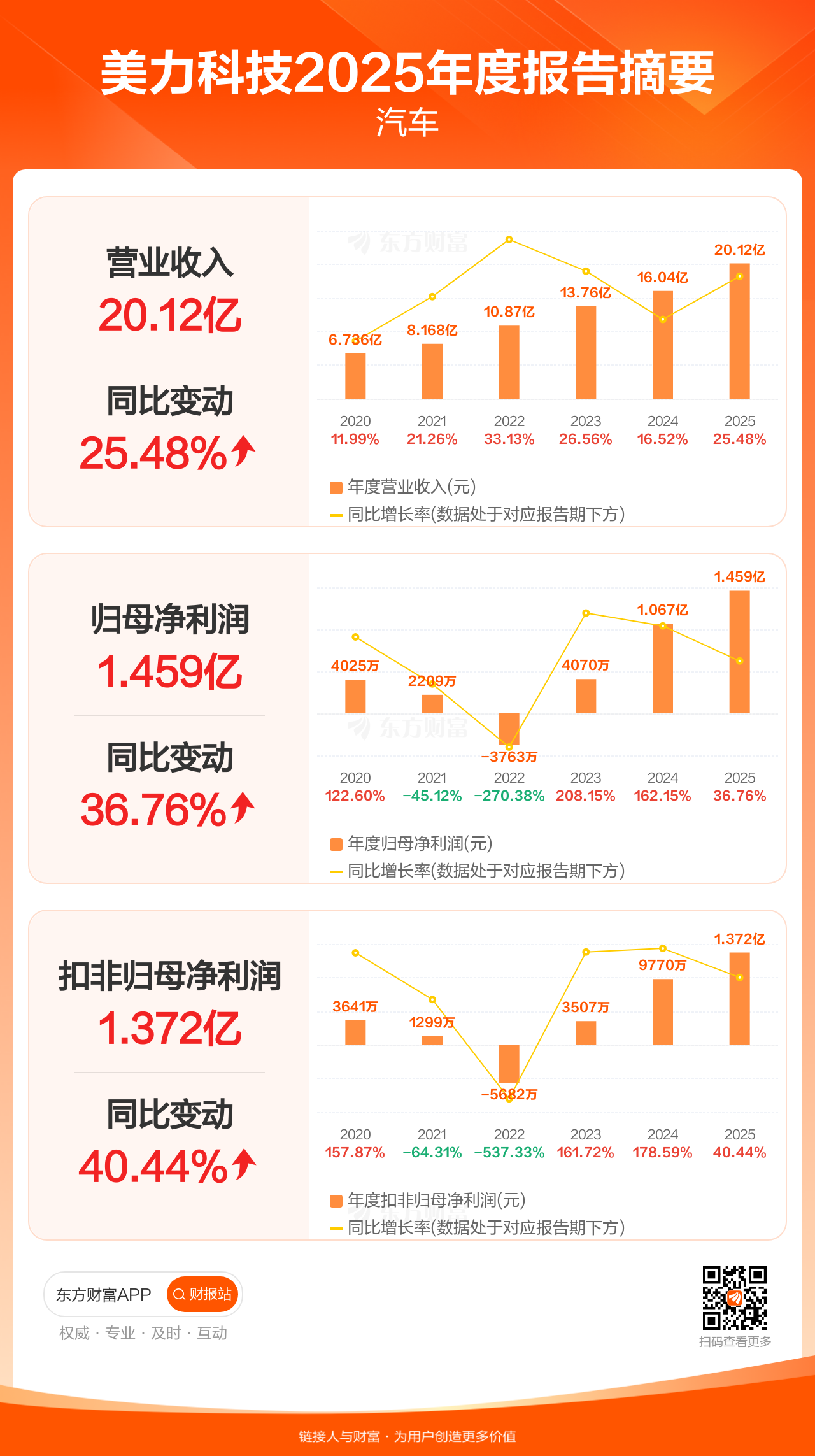 美力科技4月10日发布2025年年报显示,公司全年实现营业收入20.12亿元,同比增长25.48%;归母净利润1.46亿元,同比增长36.76%;扣非归母净利润1.37亿元,同比增长40.44%。