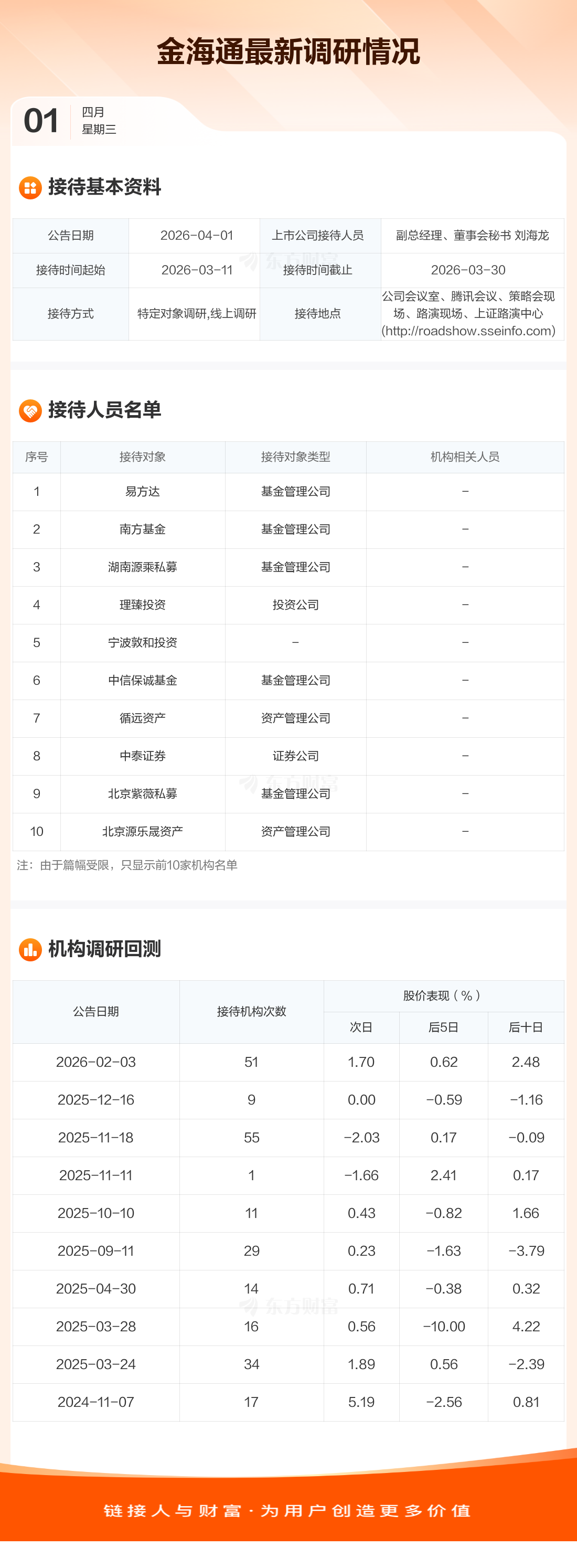 金海通4月1日公告称,3月11日至3月30日接待易方达等100家机构调研。接待人员包括副总经理、董事会秘书 刘海龙。