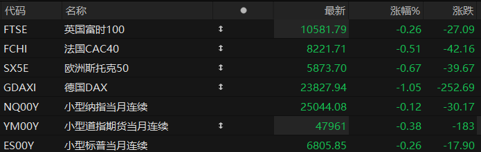 周四盘前,美股三大股指期货齐跌,欧洲主要指数普遍下跌。截至发稿,纳斯达克100指数期货跌0.12%,道指期货跌0.38%,标普500指数期货跌0.26%。