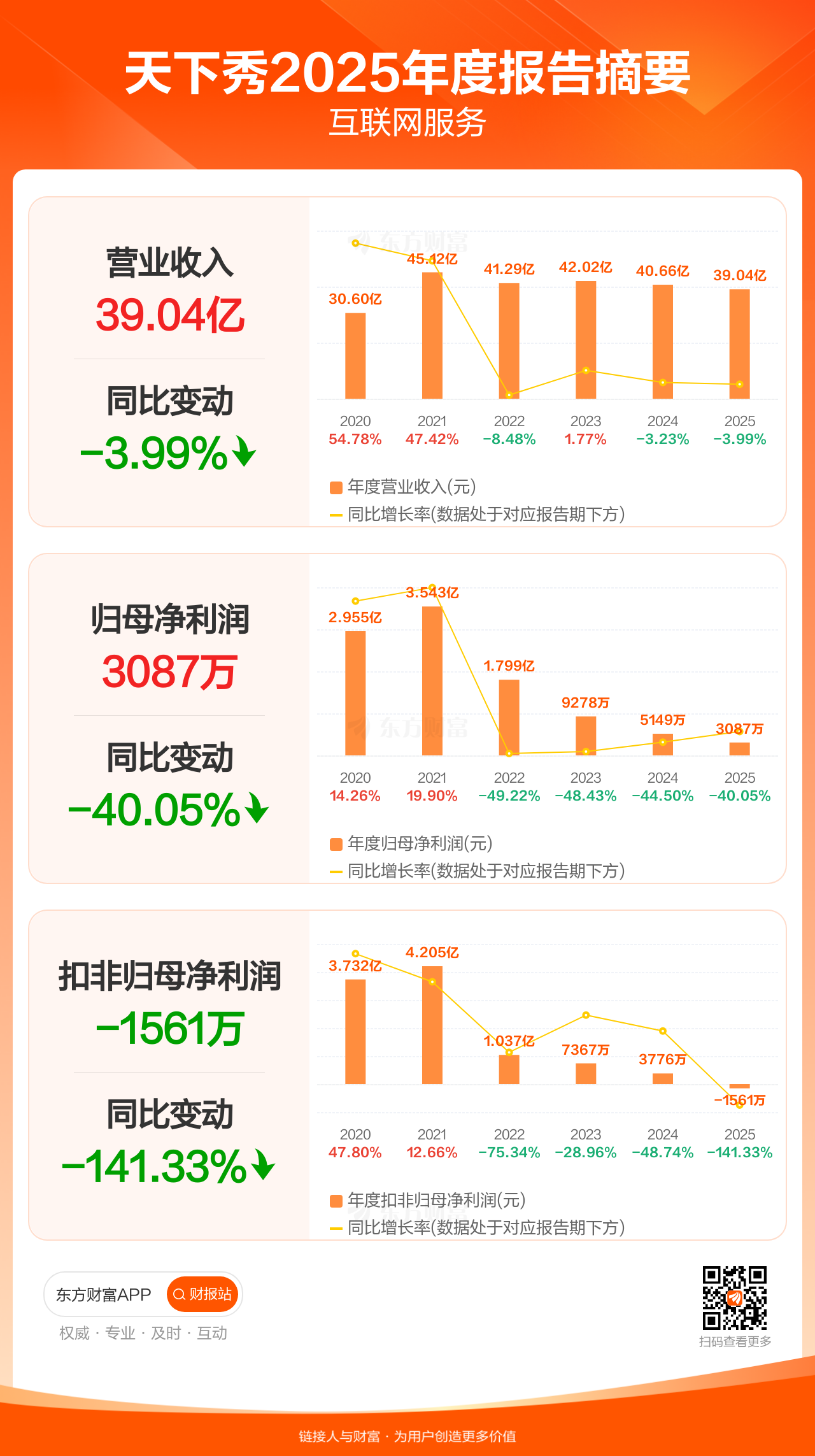 天下秀4月10日发布2025年年报显示,公司全年实现营业收入39.04亿元,同比下滑3.99%;归母净利润3086.63万元,同比下滑40.05%;扣非归母净利润-1560.54万元。