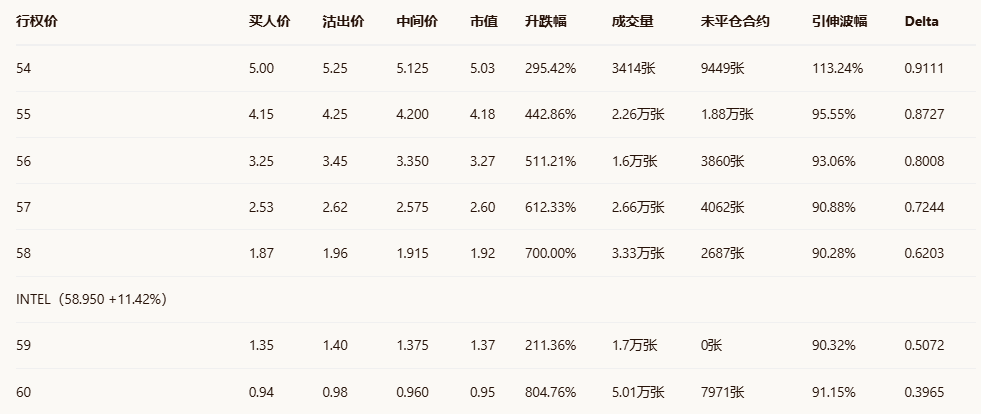英特尔收涨11.42%,成交108.62万份期权合约,看跌/看涨成交量比升至0.58。昨日隐含波动率(IV)为74.37%,处于过去一年88%的高分位水平(IV Percentile)。