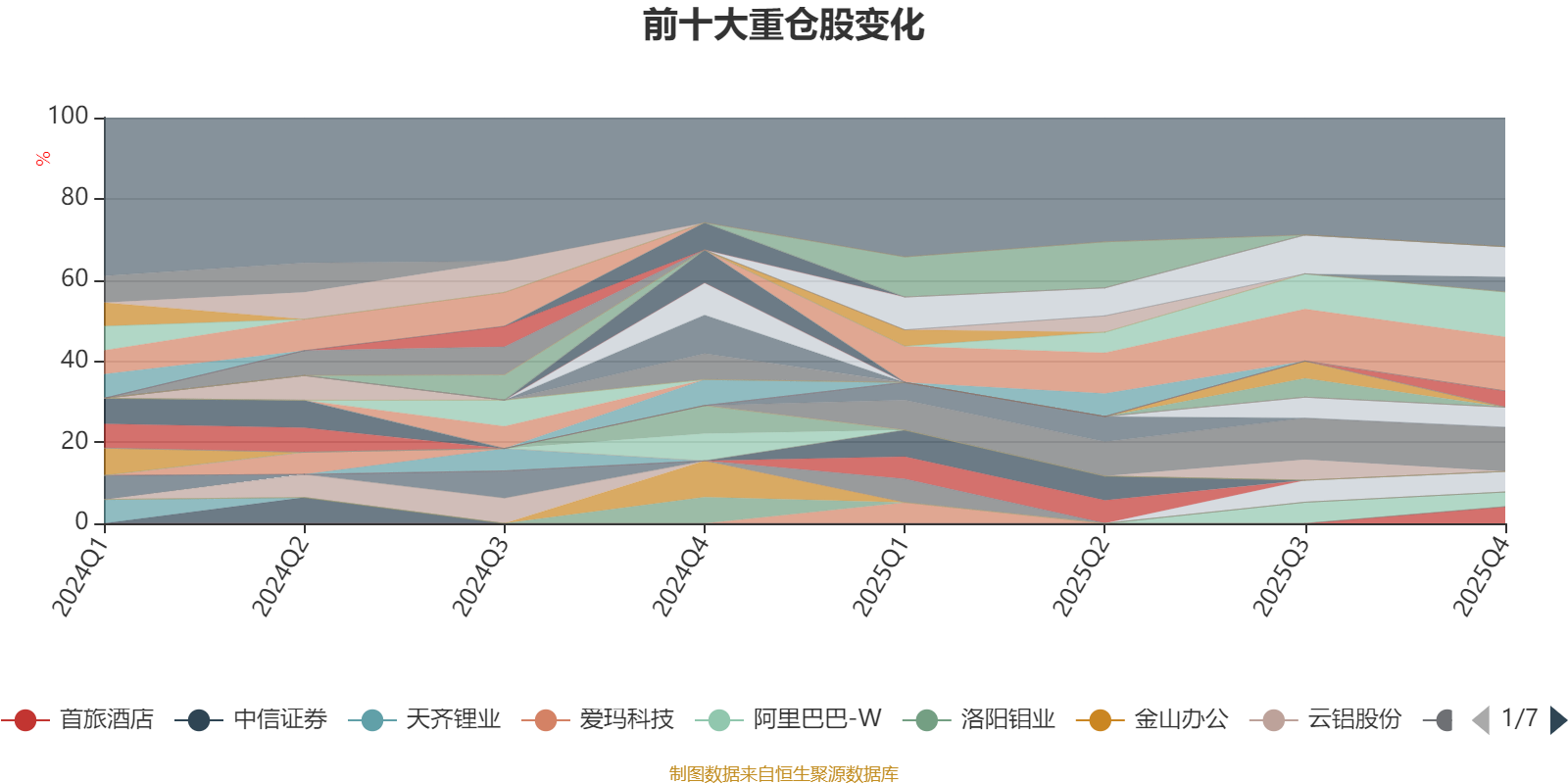 该基金持股集中度较高,近2年前十大重仓股集中度长期超过60%。截至2025年末,基金十大重仓股分别是腾讯控股、美的集团、分众传媒、海尔智家、晶苑国际、快手-W、首旅酒店、伊利股份、招商银行、阿里巴巴-W。