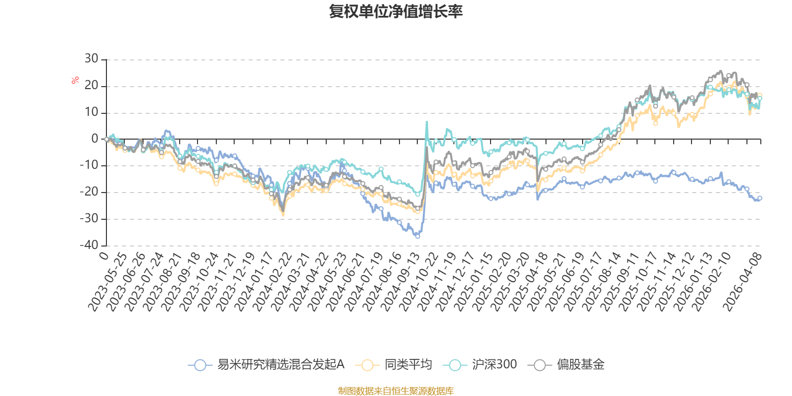 截至4月8日,易米研究精选混合发起A近三个月复权单位净值增长率为-7.43%,位于同类可比基金595/689;近半年复权单位净值增长率为-10.43%,位于同类可比基金605/689;近一年复权单位净值增长率为-0.55%,位于同类可比基金667/685。