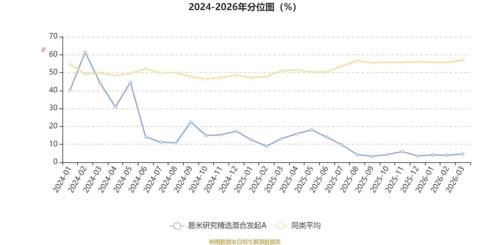 通过所选区间该基金净值增长率分位图,可以观察该基金与同类基金业绩比较情况。图为坐标原点到区间内某时点的净值增长率在同类基金中的分位数。