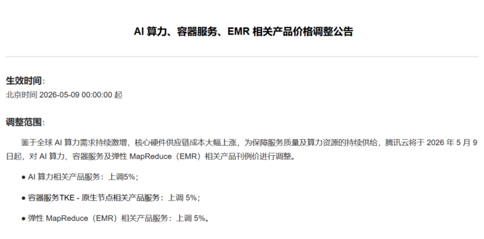 公告称,“鉴于全球AI算力需求持续激增,核心硬件供应链成本为保障服务质量及算力资源的持续供给,腾讯云将于2026年5月9日起,对AI算力、容器服务及弹性MapReduce(EMR)相关产品刊例价进行调整。”其中,AI算力、容器服务TKE-原生节点和弹性 MapReduce(EMR)相关产品服务刊例价都上调5%。
