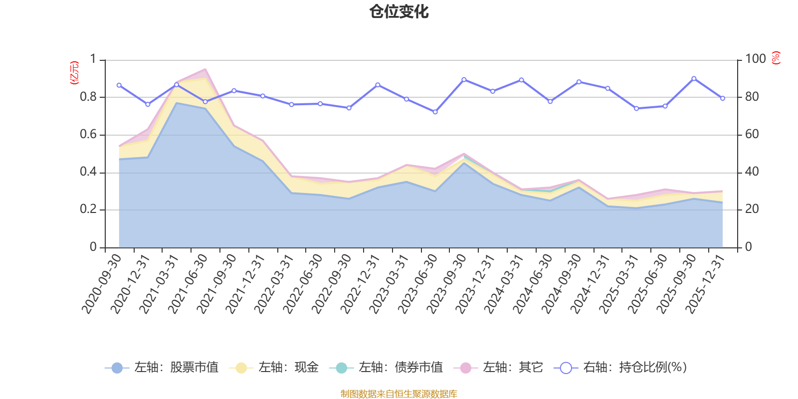 据定期报告数据统计,近三年平均股票仓位为81.95%,同类平均为72.57%。2025年三季度末基金达到90.04%的最高仓位,2023年上半年末最低,为72.27%。