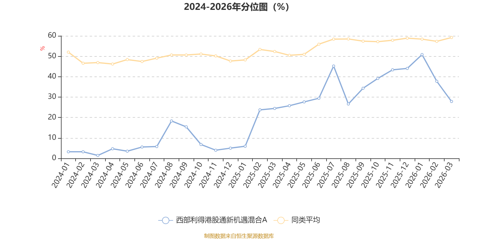 通过所选区间该基金净值增长率分位图,可以观察该基金与同类基金业绩比较情况。图为坐标原点到区间内某时点的净值增长率在同类基金中的分位数。