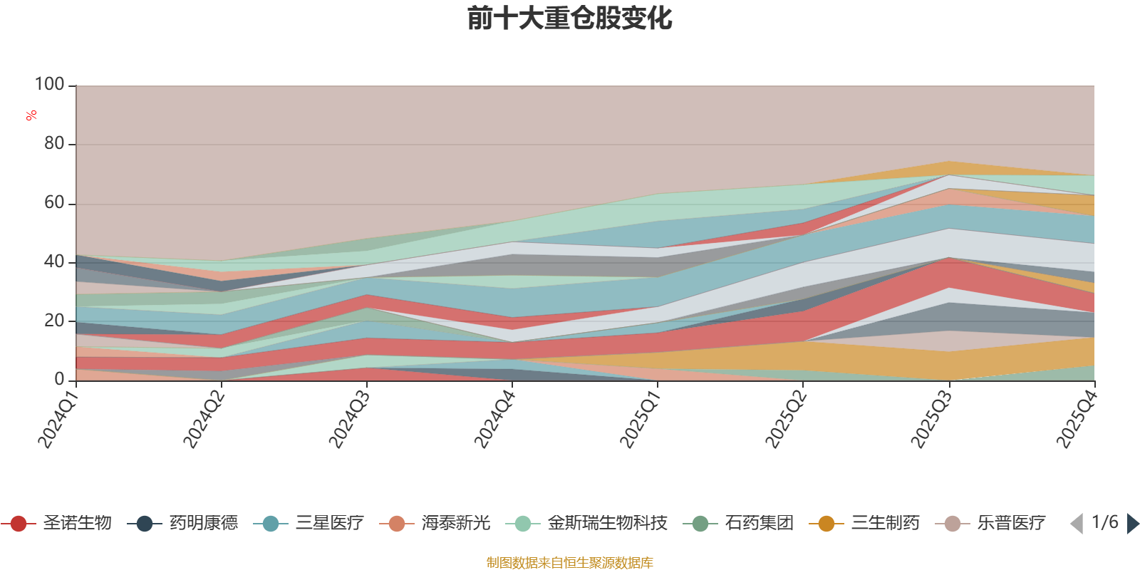 截至2025年末,基金十大重仓股分别是科伦博泰生物-B、三生制药、医脉通、迈普医学、特宝生物、福瑞医科、信达生物、石药集团、映恩生物-B、康诺亚-B。