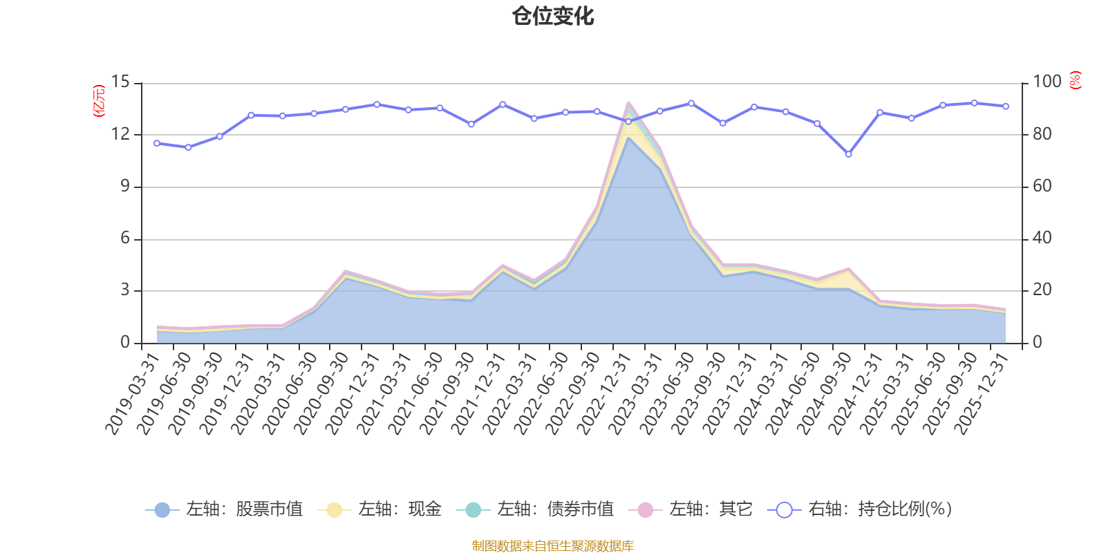 据定期报告数据统计,近三年平均股票仓位为87.71%,同类平均为72.57%。2025年三季度末基金达到92.32%的最高仓位,2024年三季度末最低,为72.63%。