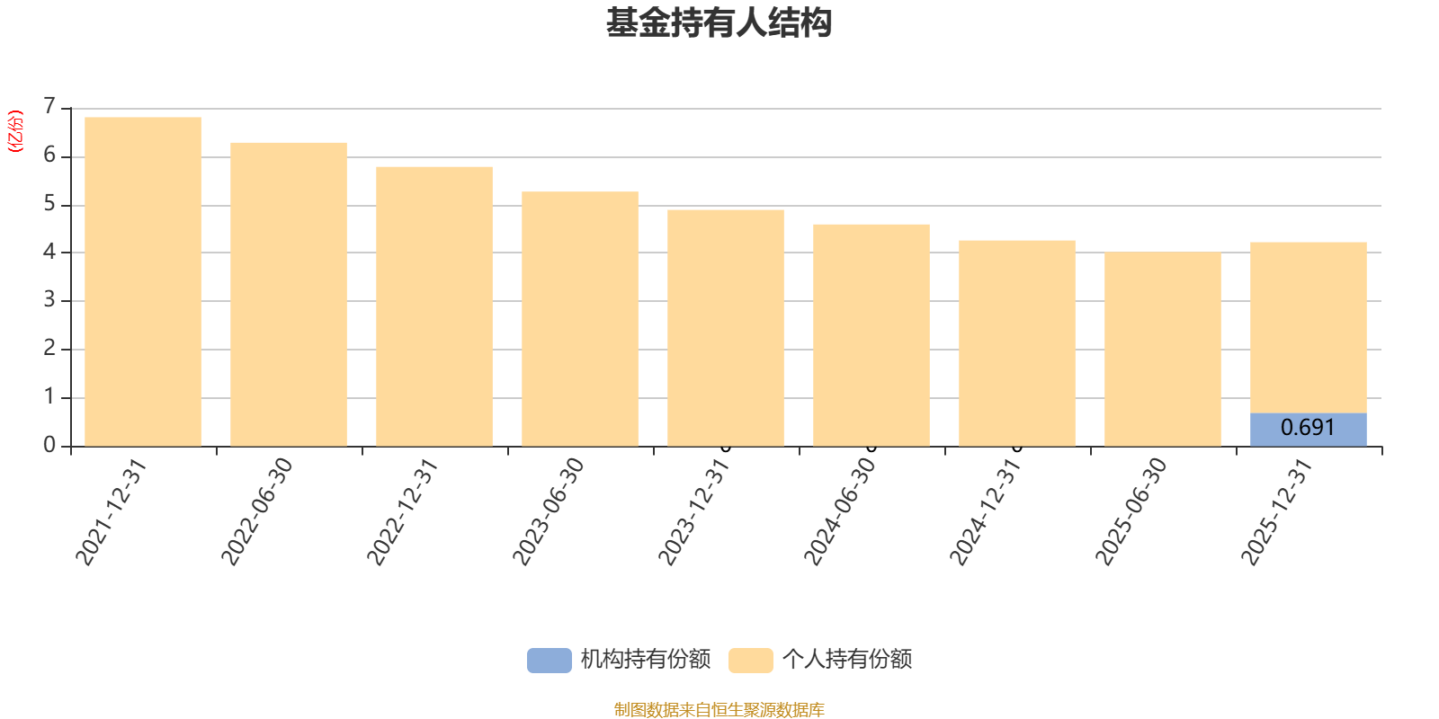 截至2025年12月31日,基金持有人共计3990户,合计持有4.22亿份。其中管理人员工持有23.54万份,占比0.06%,机构持有份额占比16.37%,个人投资者占比83.63%。