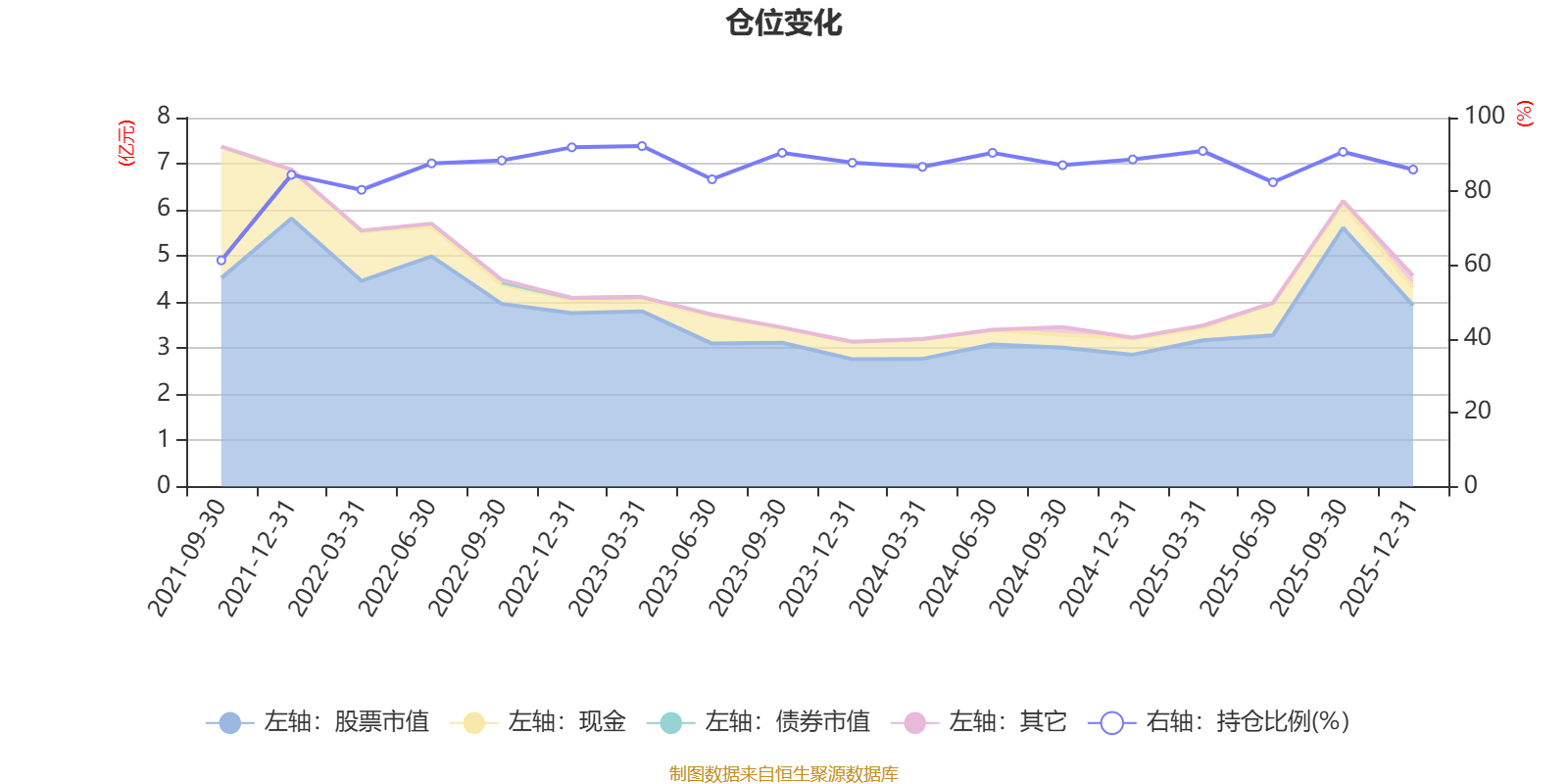 据定期报告数据统计,近三年平均股票仓位为88.06%,同类平均为85.83%。2023年一季度末基金达到92.28%的最高仓位,2021年三季度末最低,为61.31%。