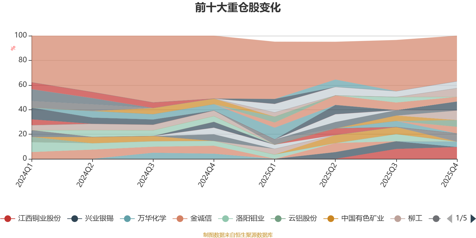 截至2025年末,基金十大重仓股分别是江西铜业股份、铜陵有色、中国海洋石油、中国铝业、华友钴业、紫金矿业、宏桥控股、盐湖股份、万华化学、天山铝业。