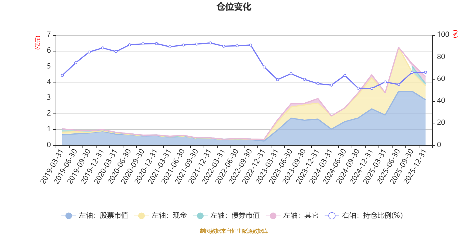 据定期报告数据统计,近三年平均股票仓位为58.88%,同类平均为72.57%。2021年末基金达到92.91%的最高仓位,2024年末最低,为51.58%。
