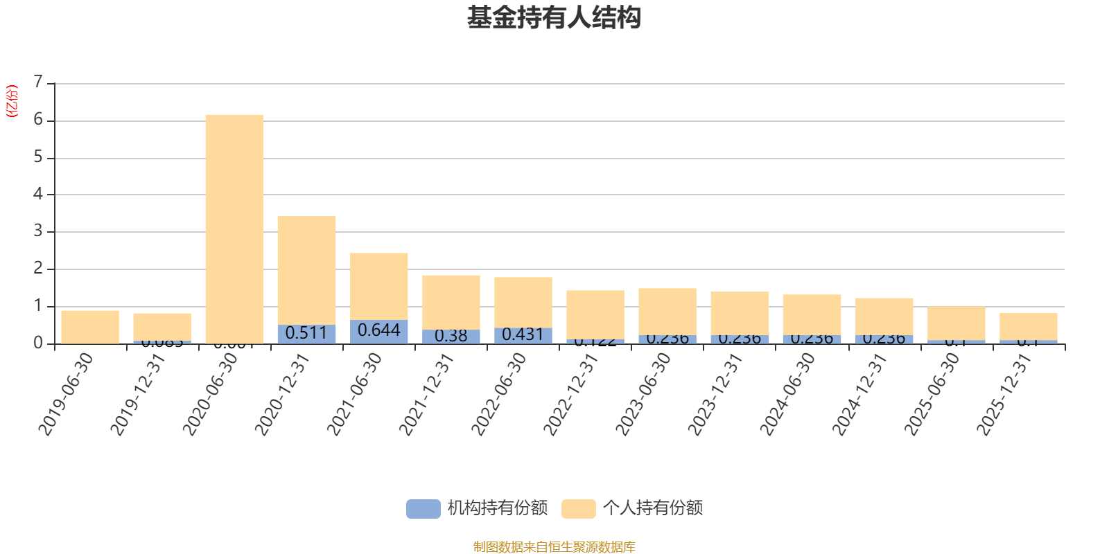 截至2025年12月31日,基金持有人共计4363户,合计持有8278.47万份。其中管理人员工持有5.59万份,占比0.07%,机构持有份额占比12.09%,个人投资者占比87.91%。