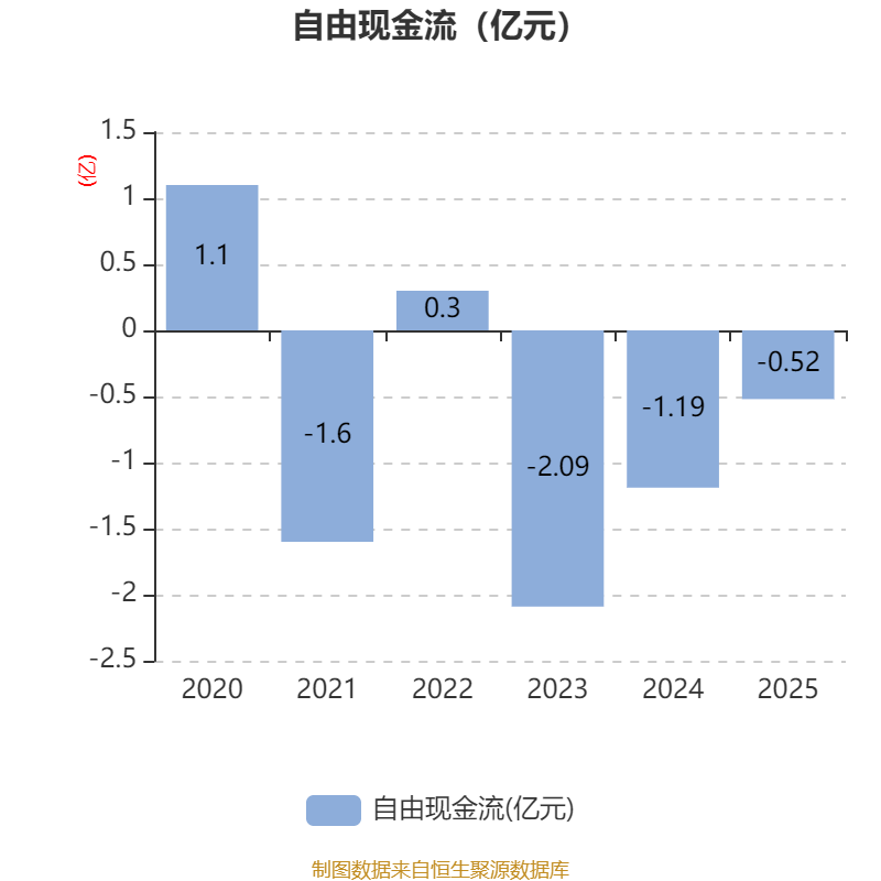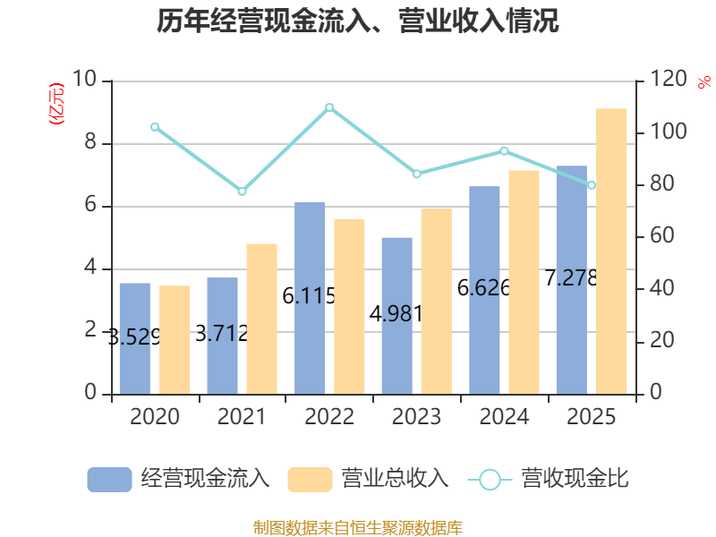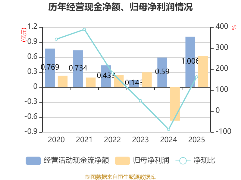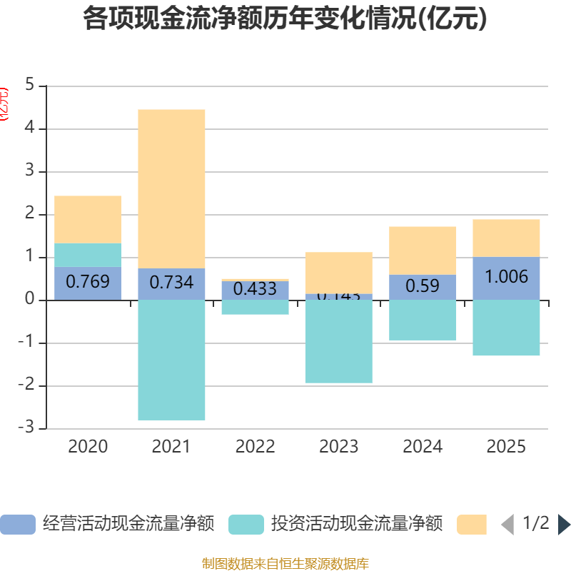 截至2025年,公司经营活动现金流净额为1.01亿元,同比增长70.5%;筹资活动现金流净额8705.35万元,同比减少2469.72万元;投资活动现金流净额-1.3亿元,上年同期为-9488.46万元。