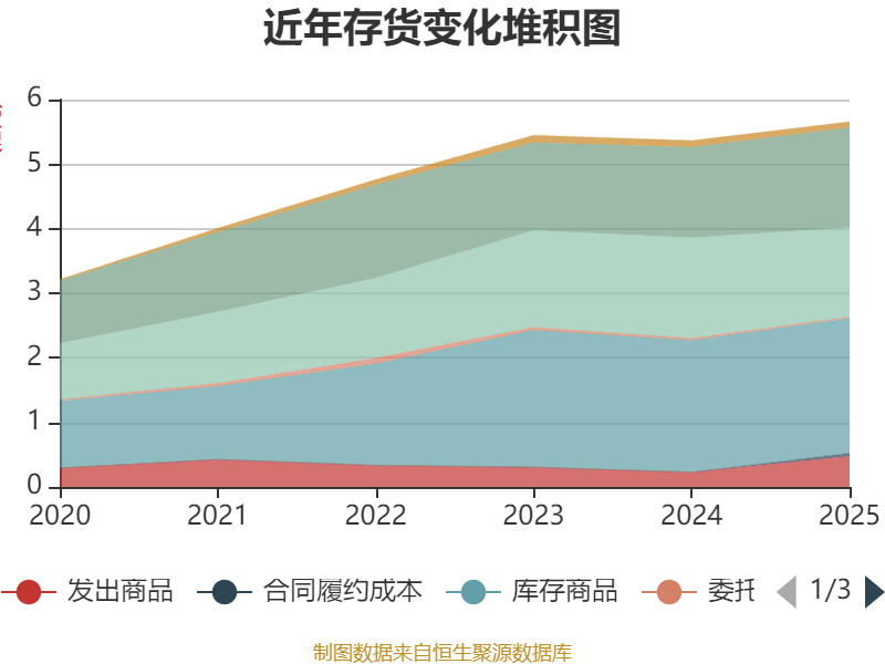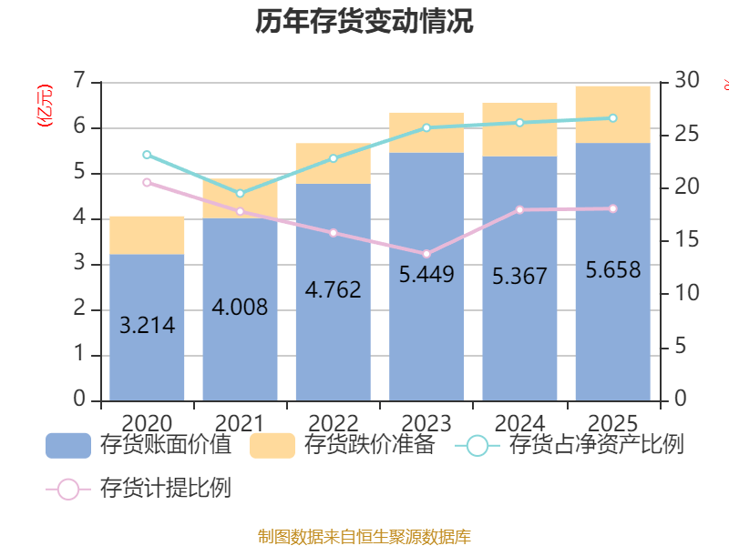 从存货变动来看,截至2025年末,公司存货账面价值为5.66亿元,占净资产的26.59%,较上年末增加2901.77万元。其中,存货跌价准备为1.25亿元,计提比例为18.06%。