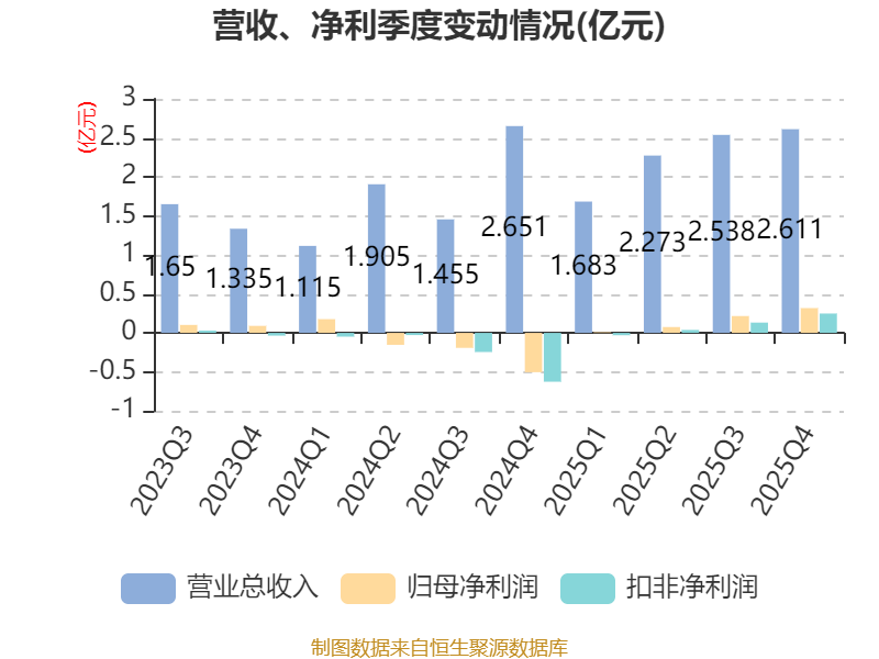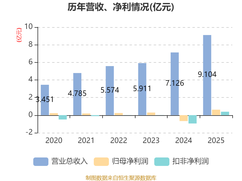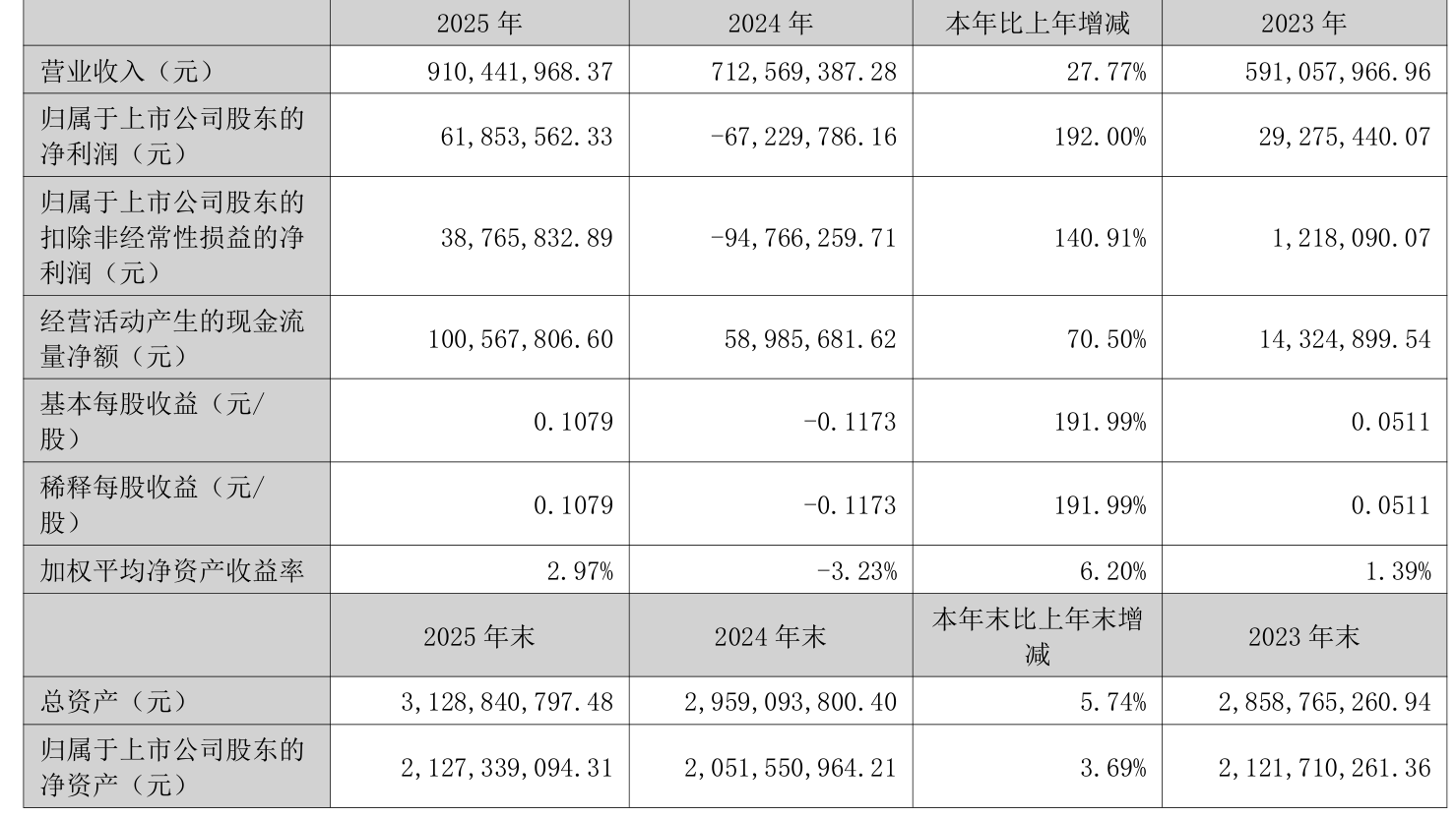 中证智能财讯博云新材(002297)4月10日披露2025年年度报告。2025年,公司实现营业总收入9.1亿元,同比增长27.77%;归母净利润6185.36万元,同比扭亏;扣非净利润3876.58万元,同比扭亏;经营活动产生的现金流量净额为1.01亿元,同比增长70.50%;报告期内,博云新材基本每股收益为0.1079元,加权平均净资产收益率为2.97%。