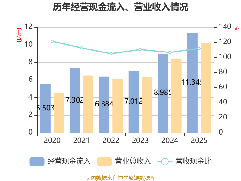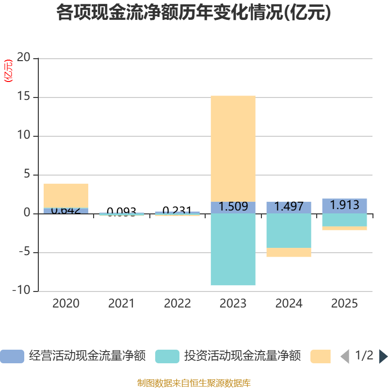 截至2025年,公司经营活动现金流净额为1.91亿元,同比增长27.79%;筹资活动现金流净额-4791.23万元,同比增加6797.7万元;投资活动现金流净额-1.68亿元,上年同期为-4.44亿元。