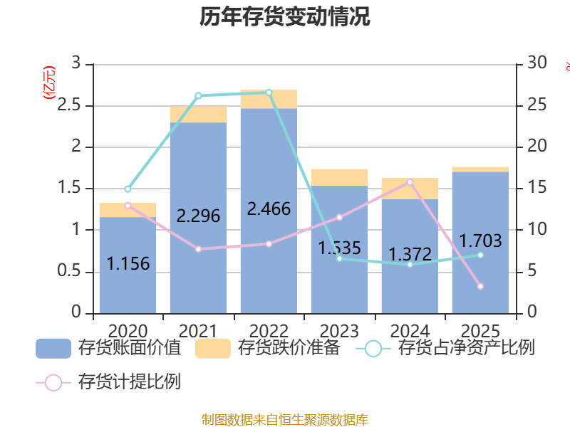从存货变动来看,截至2025年末,公司存货账面价值为1.7亿元,占净资产的6.99%,较上年末增加3314.11万元。其中,存货跌价准备为566.55万元,计提比例为3.22%。