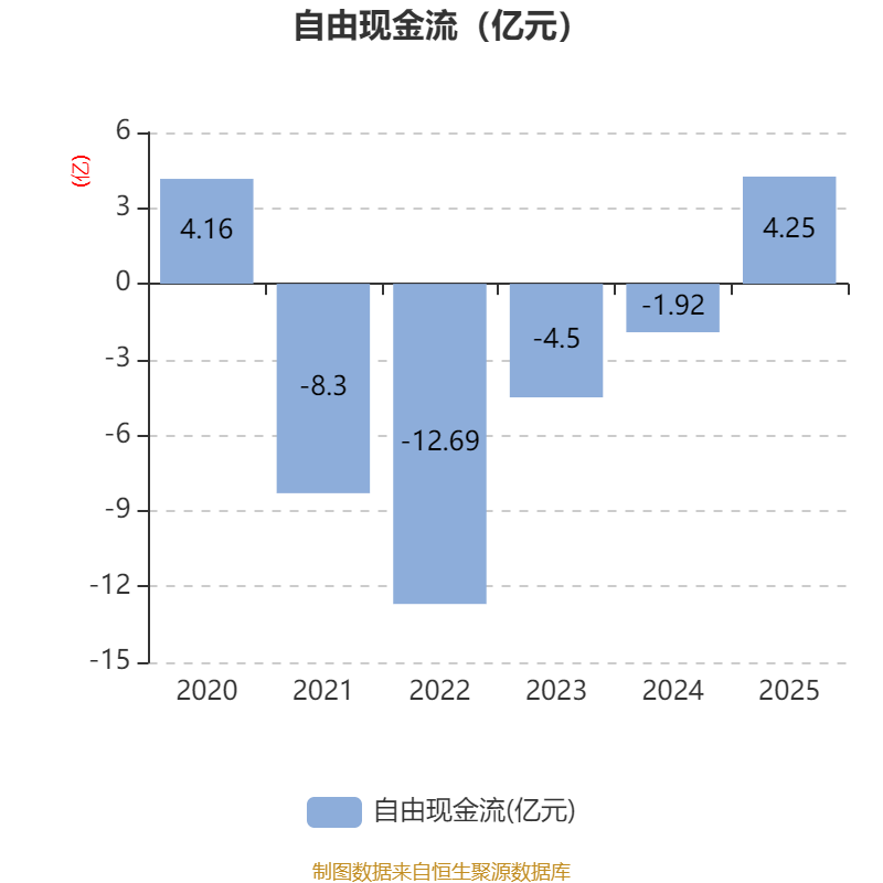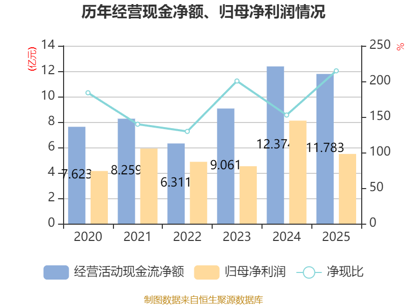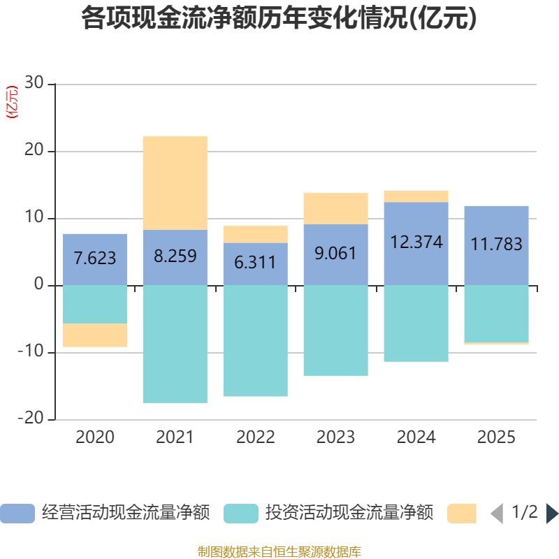 截至2025年,公司经营活动现金流净额为11.78亿元,同比下降4.77%;筹资活动现金流净额-2612.44万元,同比减少1.96亿元;投资活动现金流净额-8.58亿元,上年同期为-11.43亿元。