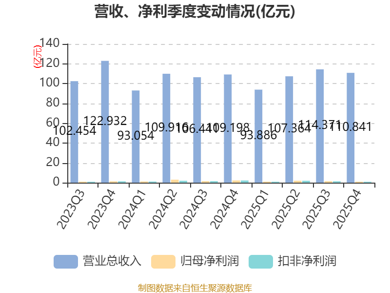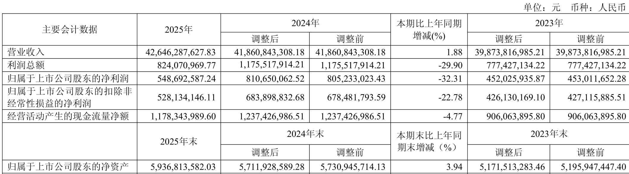 中证智能财讯甬金股份(603995)4月10日披露2025年年度报告。2025年,公司实现营业总收入426.46亿元,同比增长1.88%;归母净利润5.49亿元,同比下降32.31%;扣非净利润5.28亿元,同比下降22.78%;经营活动产生的现金流量净额为11.78亿元,同比下降4.77%;报告期内,甬金股份基本每股收益为1.51元,加权平均净资产收益率为9.44%。公司2025年度分配预案为:拟向全体股东每10股派现5元(含税)。
