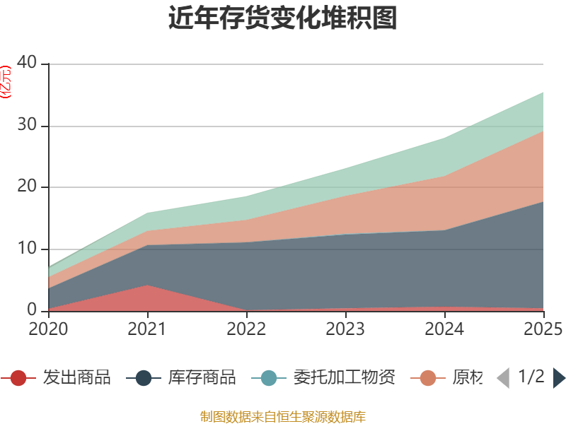 从存货变动来看,截至2025年末,公司存货账面价值为35.33亿元,占净资产的59.52%,较上年末增加7.4亿元。其中,存货跌价准备为4692.15万元,计提比例为1.31%。