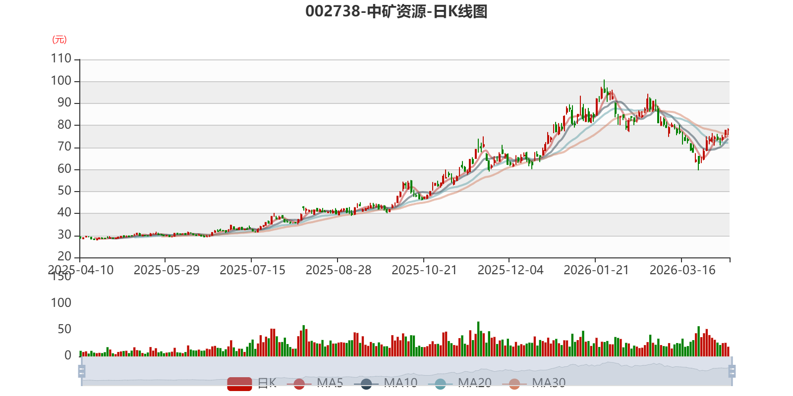 中证智能财讯中矿资源(002738)4月9日晚间披露业绩预告,预计2026年一季度归母净利润5亿元至5.5亿元,同比增长270.97%-308.07%;扣非净利润预计4.5亿元至5亿元,同比增长953.05%-1070.06%;基本每股收益0.693元/股-0.7623元/股。以4月9日收盘价计算,中矿资源目前市盈率(TTM)约为64.47倍-68.39倍,市净率(LF)约4.68倍,市销率(TTM)约8.51倍。
