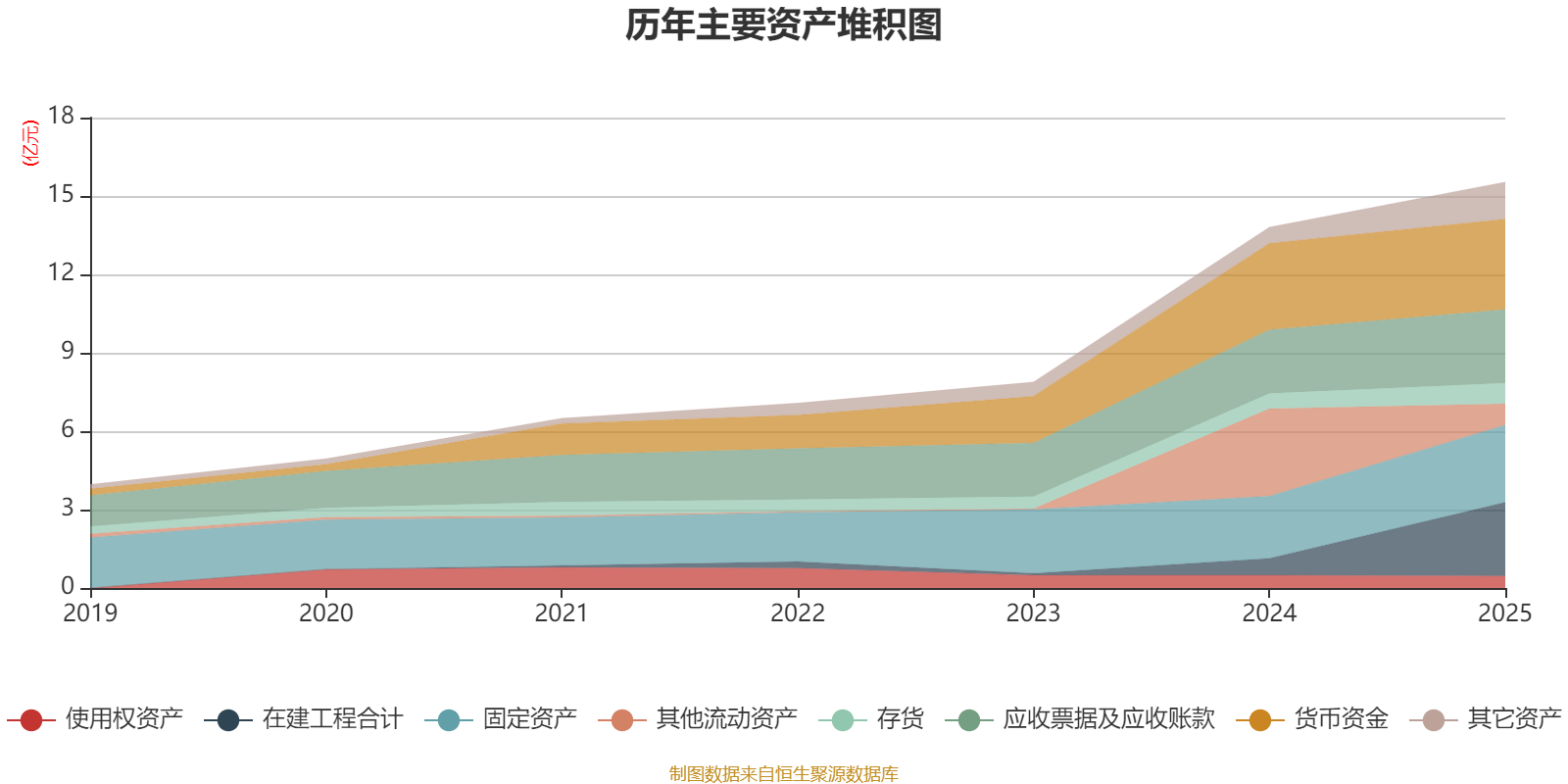 资产重大变化方面,截至2025年末,公司其他流动资产较上年末减少75.7%,占公司总资产比重下降18.98个百分点;在建工程合计较上年末增加330.65%,占公司总资产比重上升13.4个百分点;其他非流动资产较上年末增加1428.69%,占公司总资产比重上升2.32个百分点;交易性金融资产合计占公司总资产的1.93%,上年末为0。