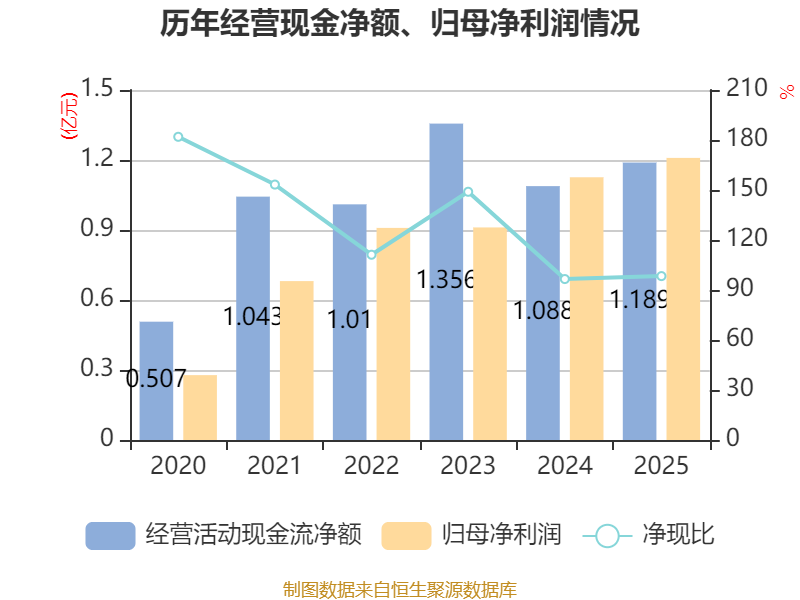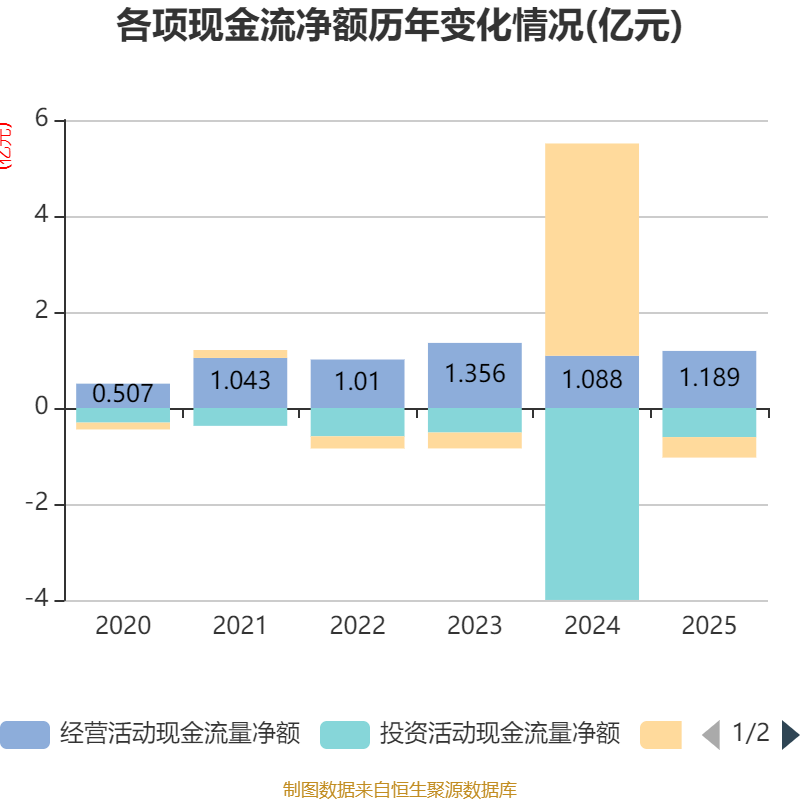 截至2025年,公司经营活动现金流净额为1.19亿元,同比增长9.29%;筹资活动现金流净额-4273.1万元,同比减少4.85亿元;投资活动现金流净额-6059.14万元,上年同期为-4亿元。