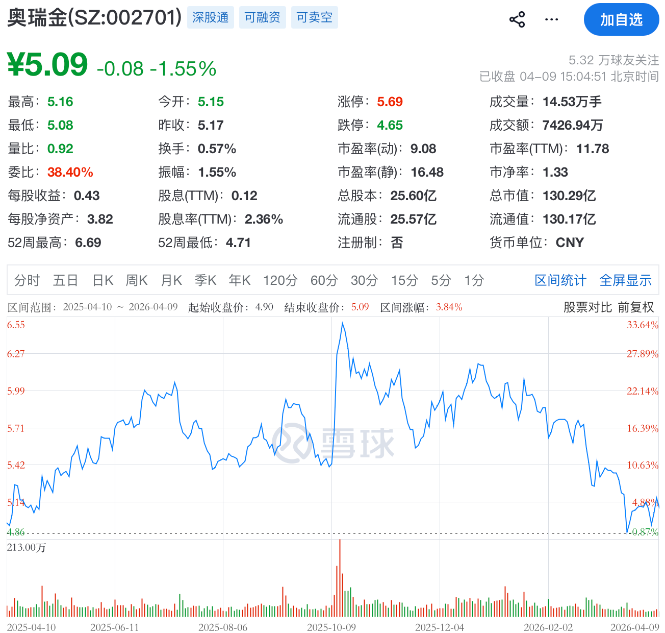 二级市场上,截至4月9日收盘,奥瑞金下跌1.55%报5.09元/股,总市值约130.29亿元。