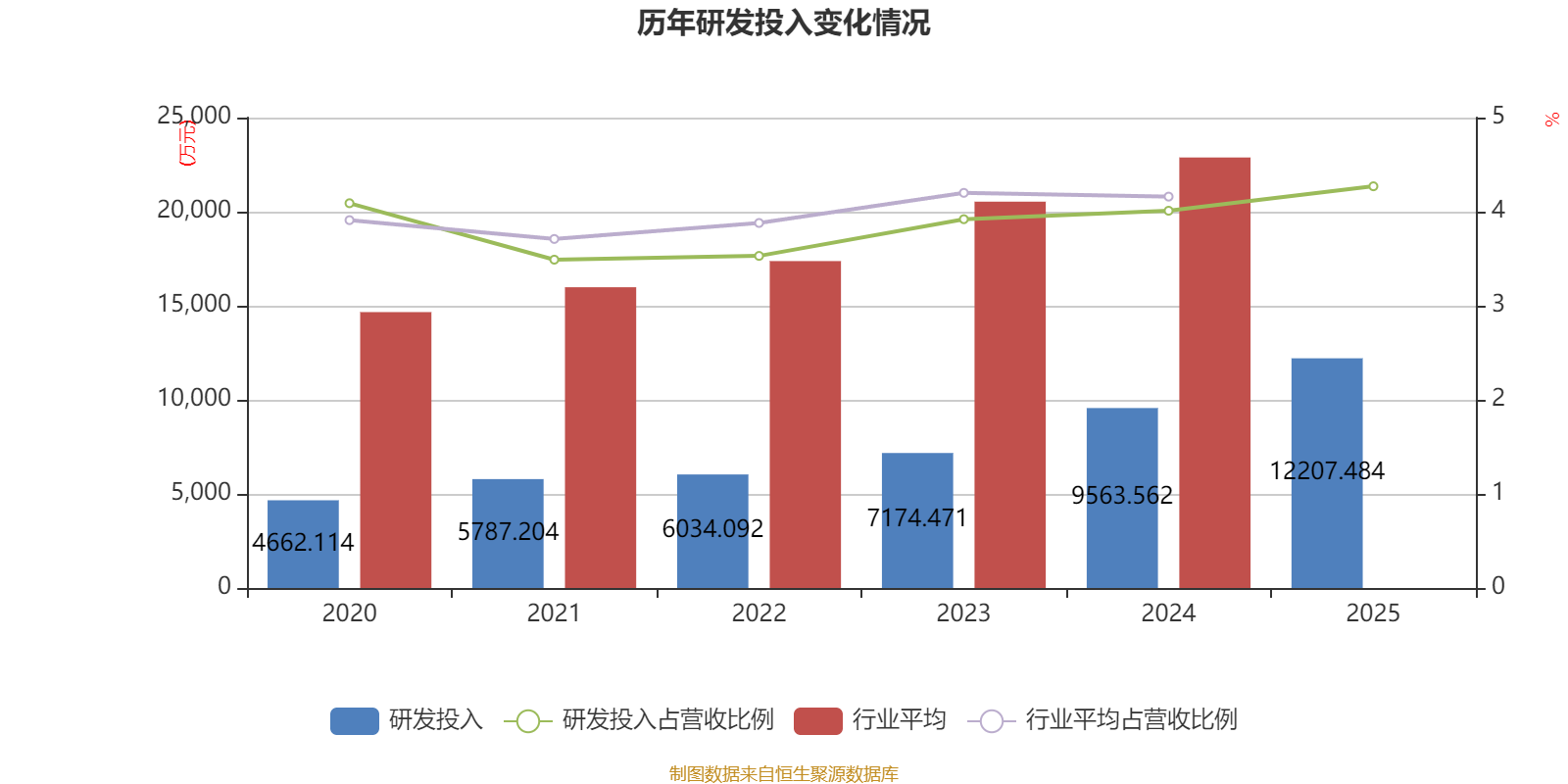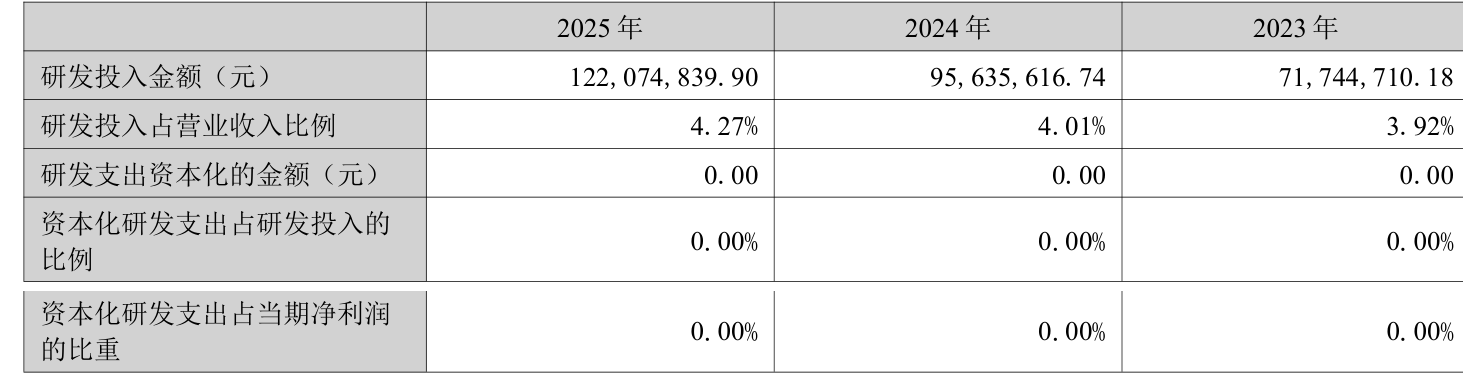 2025年全年,公司研发投入金额为1.22亿元,同比增长27.65%;研发投入占营业收入比例为4.27%,相比上年同期上升0.26个百分点。此外,公司全年研发投入资本化率为0%。