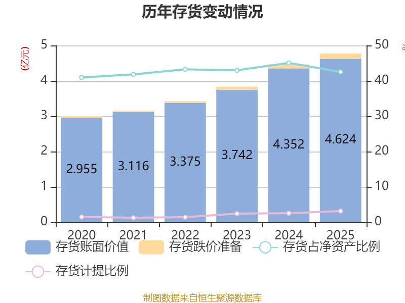 从存货变动来看,截至2025年末,公司存货账面价值为4.62亿元,占净资产的42.51%,较上年末增加2721.87万元。其中,存货跌价准备为1503.73万元,计提比例为3.15%。