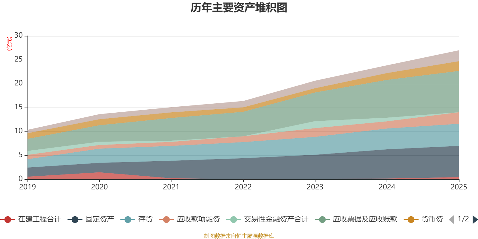 资产重大变化方面,截至2025年末,公司交易性金融资产合计较上年末减少100%,占公司总资产比重下降3.18个百分点;应收款项融资较上年末增加61.23%,占公司总资产比重上升2.68个百分点;货币资金较上年末增加42.13%,占公司总资产比重上升1.53个百分点;固定资产较上年末增加6.98%,占公司总资产比重下降1.41个百分点。