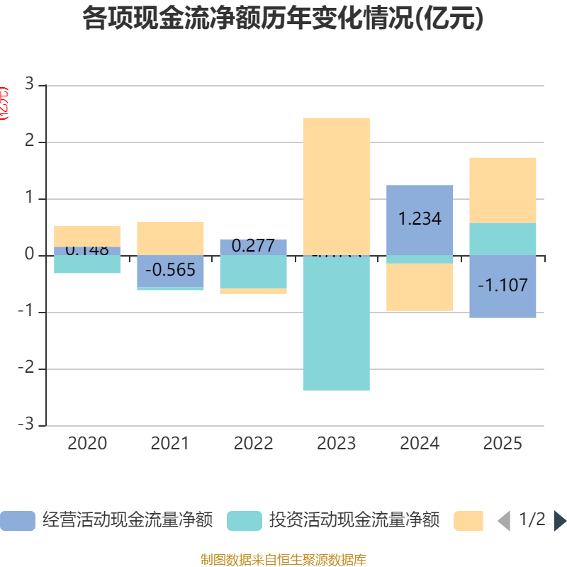 截至2025年,公司经营活动现金流净额为-1.11亿元,同比减少2.34亿元;筹资活动现金流净额1.15亿元,同比增加1.98亿元;投资活动现金流净额5700.09万元,上年同期为-1483.14万元。